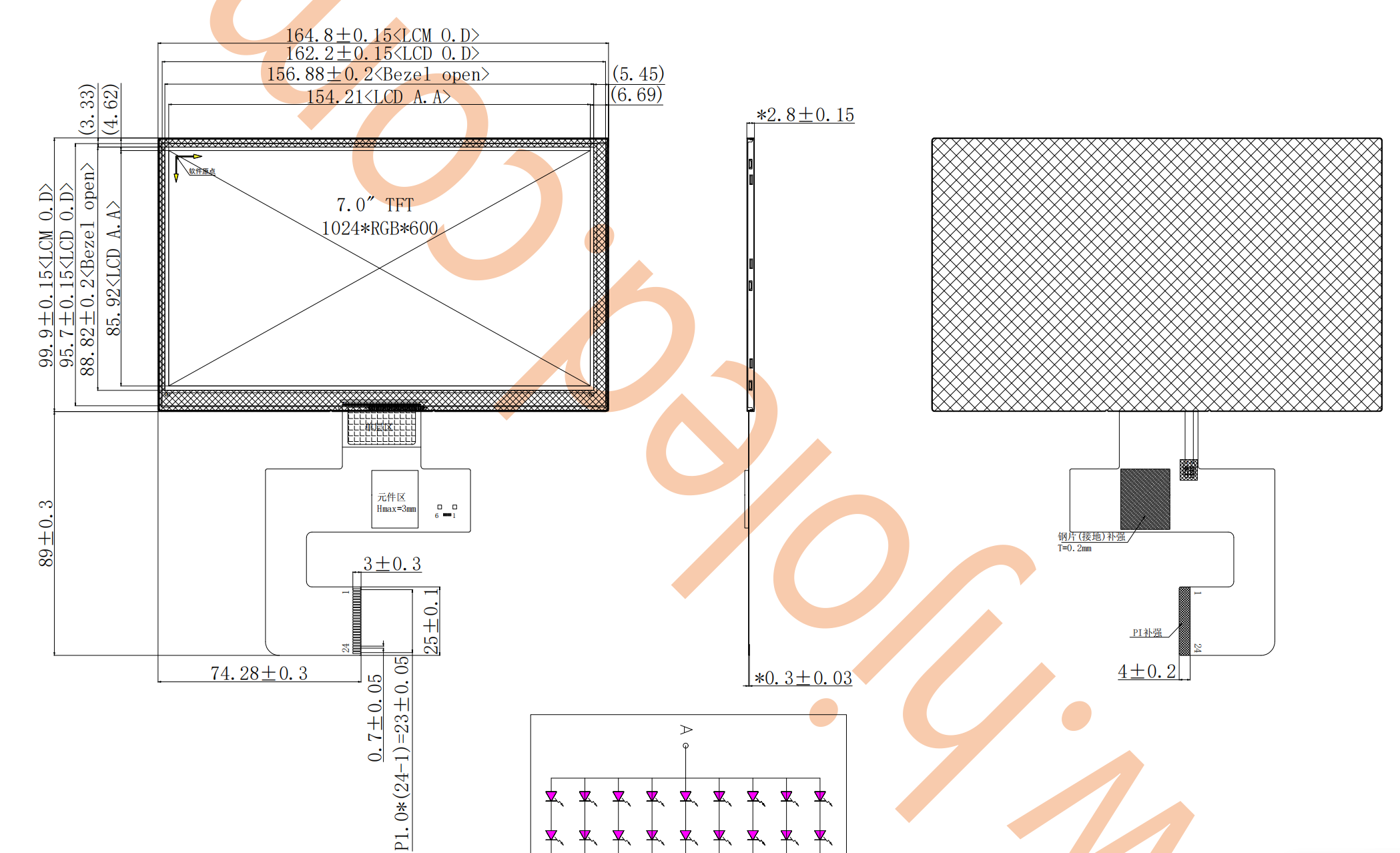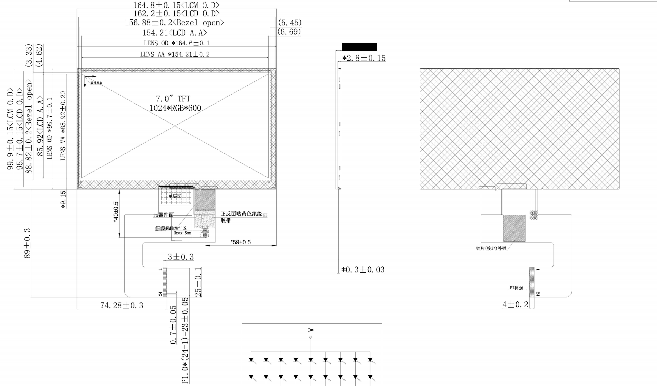 7 インチ TFT 横長画面は通常、解像度 1024*600 と 4 チャネル MIPI インターフェイスを備えています。 2 チャンネルの LCD スクリーンは稀であり、静電容量式タッチスクリーン ケーブルと LCD スクリーン ケーブルが統合されているものはさらに稀であるため、ハードウェア エンジニアの負担が増加します。 Shenzhen Honjia Technology のエンジニアは、解像度 1024*600、2 チャネル MIPI インターフェイス、および静電容量式タッチスクリーンを備えた 7 インチ IPS 横長スクリーンの量産に成功しました。 24 ピン コネクタは、タッチスクリーンとディスプレイの信号を 1 本のケーブル インターフェイスで統合し、顧客の設計を容易にします。