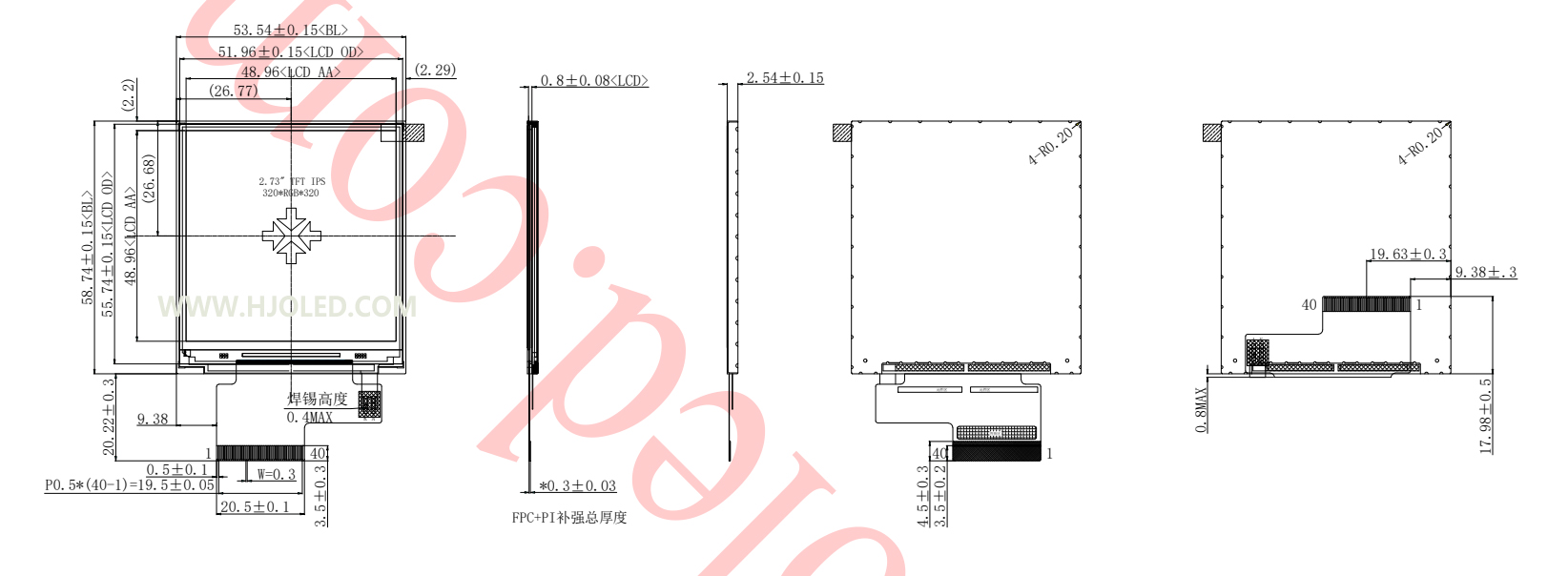 これ2.73インチスクエア液晶画面解像度は 320x320 ピクセルです。業界で実績のある成熟したドライバー IC (特に ILI9488 または ST7796) を利用し、SPI、MCU、および RGB インターフェイスをサポートします。本日は、Shenzhen Honjia Technology のエンジニアである Huang 氏が、当社の主力製品の 1 つである HJ2730-03 を紹介できることを嬉しく思います。この 2.73 インチ ディスプレイは、標準 40 ピン コネクタを備え、16 ビットおよび 18 ビット RGB インターフェイスをサポートし、ILI9488 IC によって駆動されます。高い信頼性と優れた帯電防止性能を備え、純白の光を発する6LEDバックライトを搭載しています。